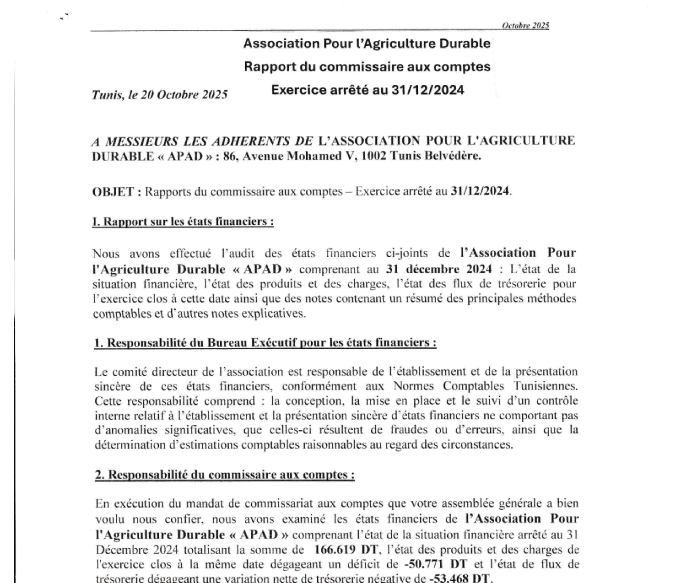 Madame/ Monsieur, Le Président du bureau de l’Association Pour l’Agriculture Durable a l’honneur d’inviter ses adhérents à l’Assemblée Générale ordinaire de l’APAD de l’année 2024 qui aura lieu le Samedi, 01 Novembre 2025 de 9H00 à 10H30 du matin à son siège sis au 86 Avenue Mohamed V, Tunis